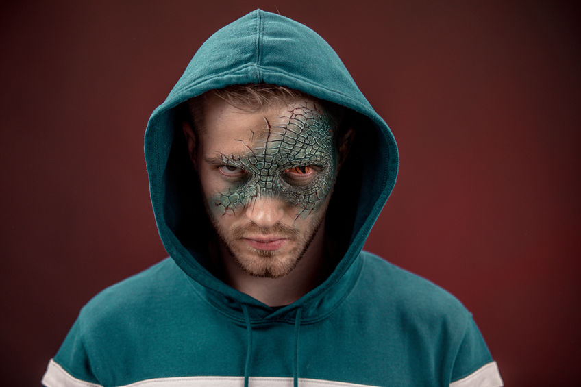 While you, unfortunately, can't turn your skin into that of a reptilian, there are some ways you can achieve the same illusion. With a generous supply of dark-green body paint, you can easily make your face and torso nearly unrecognizable (you can also use a sheer long-sleeve instead).