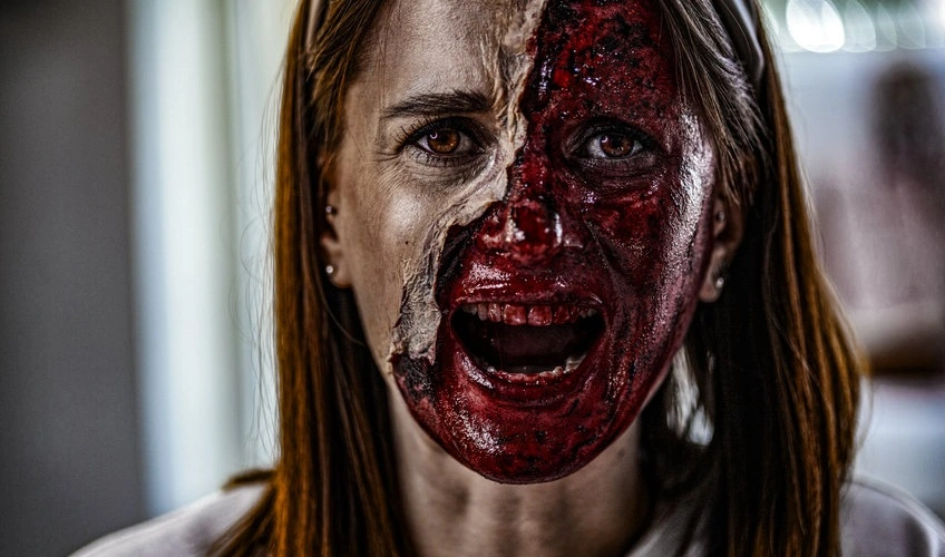 ![]() Silly movie, grisly costume concept. Effectively, part of your face is coming off due to radiation sickness. While the outfit doesn't really matter, the skin effect definitely does. When it comes to makeup and prosthetic skin, this one is on the more involved side. The makeup itself is easy enough to find, as special effects makeup is designed for just such purposes. More involved effects can also be found thanks to their use in theater and the like. As for pulling off the effects, guides can be found online, but the basics with regular makeup apply as well. The first layers need to be placed and built upon to create the contrasts, depth, and effects needed for the costume. Fake skin can be made from gels and painted to suit the needs of the costume. With both, keep potential allergies and sensitive skin in mind, as fake skin and makeup can irritate both.