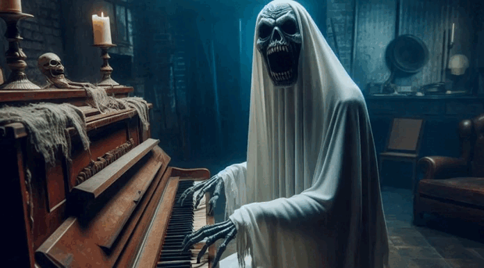 The teens make their way into the family room. It's a dark dusty room - an old upright piano sits up against one of the walls. They explore the chamber for a several minutes, get bored and leave. As they exit the room a dead creature walks down the stairs and sits down at the piano and plays Mozart's, 'Funeral March' on its old ivory keys... The teens move forward