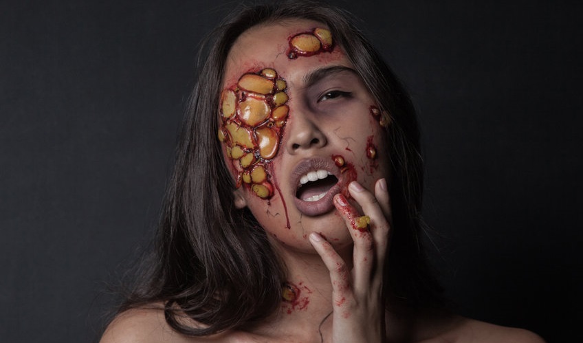 ![]() Unfortunately, an experiment for ultimate beauty ended in a horrific skin condition. First, we need to create the fake pus-filled blister. Here, buy a bag of gelatin powder (always available in the baking aisle of any grocery store) and a small bag of glycerin (usually found in the pharmacy section). Mix 1 tbsp. of gelatin with 1 tbsp. of glycerin and a half tbsp. of water in a small cup. Then microwave the mixture in 5 second bursts until it is liquid. When hot, mix in yellow/white food coloring and pour droplets of the mixture onto parchment paper. Once cooled, use body adhesive to glue the pus droplets onto your face. Be sure to get creative with some fake blood to hit home the idea that these are extremely painful blisters. Caution: be sure not to get any makeup on or around your eyes! ![]()