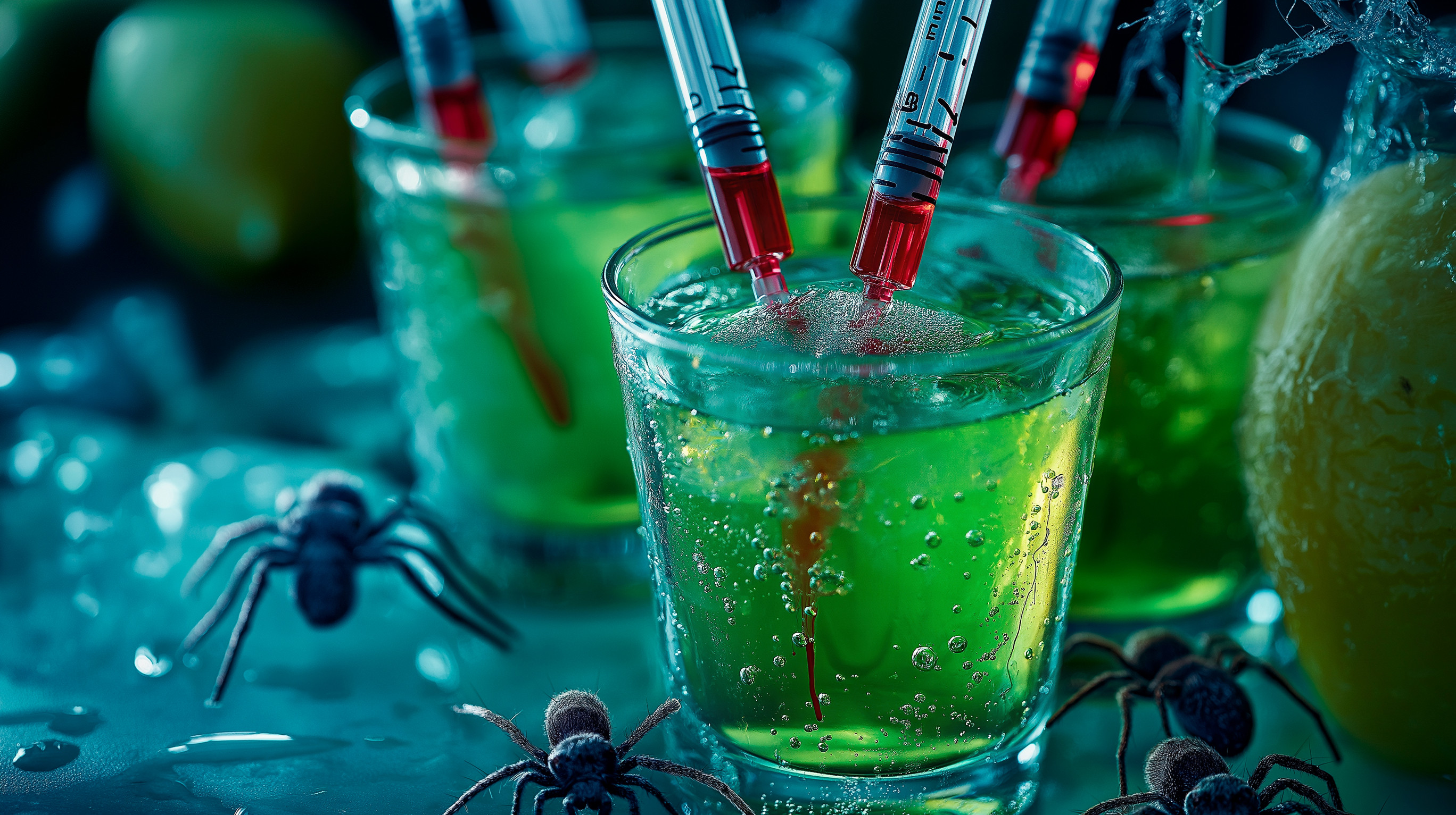 To set up the game, pour your "treats" are made with various alcoholic shots, not with hard liquor but with sweet mixed drinks and liqueurs. Include a few shots of beer as well. Then pour your "tricks" make various shots of non-alcoholic unpalatable drinks, like diluted lemon juice, plain tonic water, cooled black coffee, non-alcoholic beer, and diluted hot sauce. Be sure to keep your "tricks" separate from your "treats." To play the game, have your guests take turns rolling the dice. Guests who roll even numbers will receive "treat" drinks, while those who roll odd numbers will receive "trick" drinks. Once guests know whether they've been awarded a trick or a treat, allow them to choose their particular shots themselves, but keep the exact contents of the shot glasses secret (though you may want to ask your guests if they have any allergies). This game can be used to moderate an open bar, since requiring your guests to roll the dice if they want free booze will prevent them going overboard. For a more competitive version of the game, label all of the "trick" shots and include some really nasty ones, like toilet bowl water (label a shot of tap water as toilet water), blood (food coloring and corn syrup should do the trick), maggots (white rice with a bit of vinegar) and intestinal worms (spaghetti or ramen noodles cooked in black coffee). Further, don't dilute the lemon juice or hot sauce. Use the dice in the same way as the non-competitive version, but have your guests forfeit and stop playing if they find all of the "trick" shots too disgusting to swallow. The last person still playing wins.