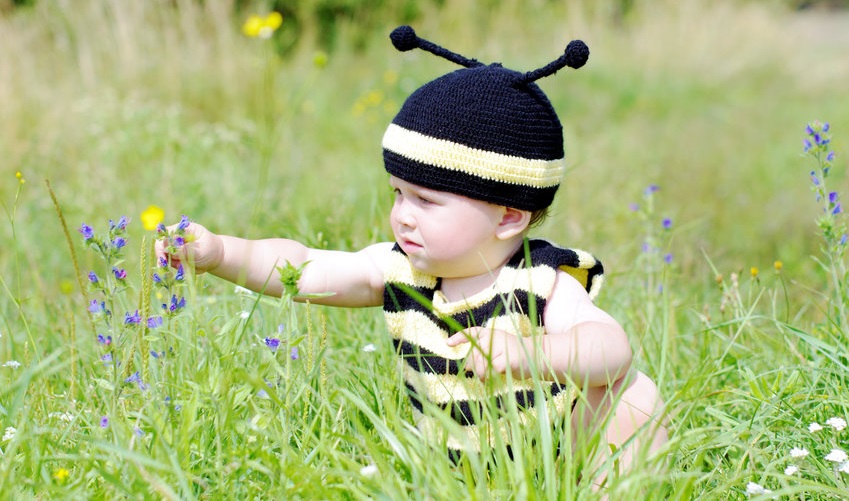 ![]() To start we're going to do a baby bee costume. Here, you will need to knit a black and yellow striped baby outfit and hat. If your knitting skills are not up to par, simply purchase one online. Another alternative is to stuff some poly-fil under the blanket to create that "round" look that most bees have. Feel free to accessorize for pictures by laying the child in a pile of sunflowers or other plants as if he/she is pollinating the garden. Since we are making a costume for a child, we need it to be loose and un-intrusive, that is why simply adorning them with a blanket and loose hat is the safest way to do so. You can also utilize some non-allergenic, non-toxic body paint to create the black and yellow striped effect on your child.
