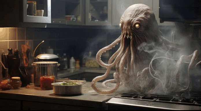 ![]() "I wonder if there's anything good to eat in the refrigerator?" John said. "Gross, don't do it," one of the girl's cries. "Oh yea," Mike continues, "I see something good." He reaches into an old rusted-out refrigerator and grabs a hairy looking meatball. "Don't do it," Brad said. But it's too late, Mike is chomping away.. As the teens leave the kitchen, a wet tentical grabs Jill's arm and pulls her back. At first she thought it was Brad clowing around; however as she truns around she finds herself staning infront of a horrific fowl-smelling squid like creature. It opens its mouth wide and sucks her entire body into its slimmy cavity. ![]()