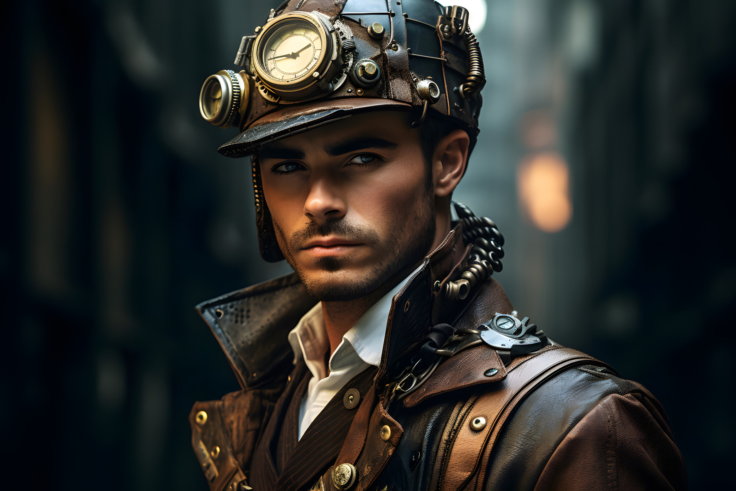 For men, simply were an old leather jacket with scuffed brown shoes with loud socks, or no socks if the mood strikes you. Of course, don't forget the goggles - it's a necessity component of steampunk fashion. If you're looking to be recognizable you could be a character from the movie Mad Max.