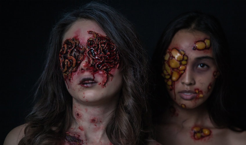 ![]() Unfortunately, an experiment for ultimate beauty ended in a horrific skin condition. First, we need to create the fake pus-filled blister. Here, buy a bag of gelatin powder (always available in the baking aisle of any grocery store) and a small bag of glycerin (usually found in the pharmacy section). Mix 1 tbsp. of gelatin with 1 tbsp. of glycerin and a half tbsp. of water in a small cup. Then microwave the mixture in 5 second bursts until it is liquid. When hot, mix in yellow/white food coloring and pour droplets of the mixture onto parchment paper. Once cooled, use body adhesive to glue the pus droplets onto your face. Be sure to get creative with some fake blood to hit home the idea that these are extremely painful blisters. Caution: be sure not to get any makeup on or around your eyes! ![]()
